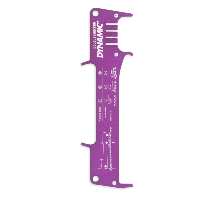 Double Checker er et laserskåret præcisionsværktøj i lommestørrelse til præcis kontrol af kædeslid og rotortykkelse. Det har en indbygget kædekrog for at holde kæden stabil under montering og en lineal til hurtige målinger. Kørsel med en slidt kæde og rotorer, der er for tynde, kan føre til, at kæden knækker, upålidelig bremseevne og generelt øget slid på din gearkasse. Med Double Checker ved du præcis, hvornår du skal udskifte din kæde og rotorer for at forblive sikker og hurtig, samtidig med at du forlænger levetiden på dit udstyr. Double Checker fungerer på alle 7-13-speed kæder, inklusive SRAM Flattop, Shimano og Campagnolo.