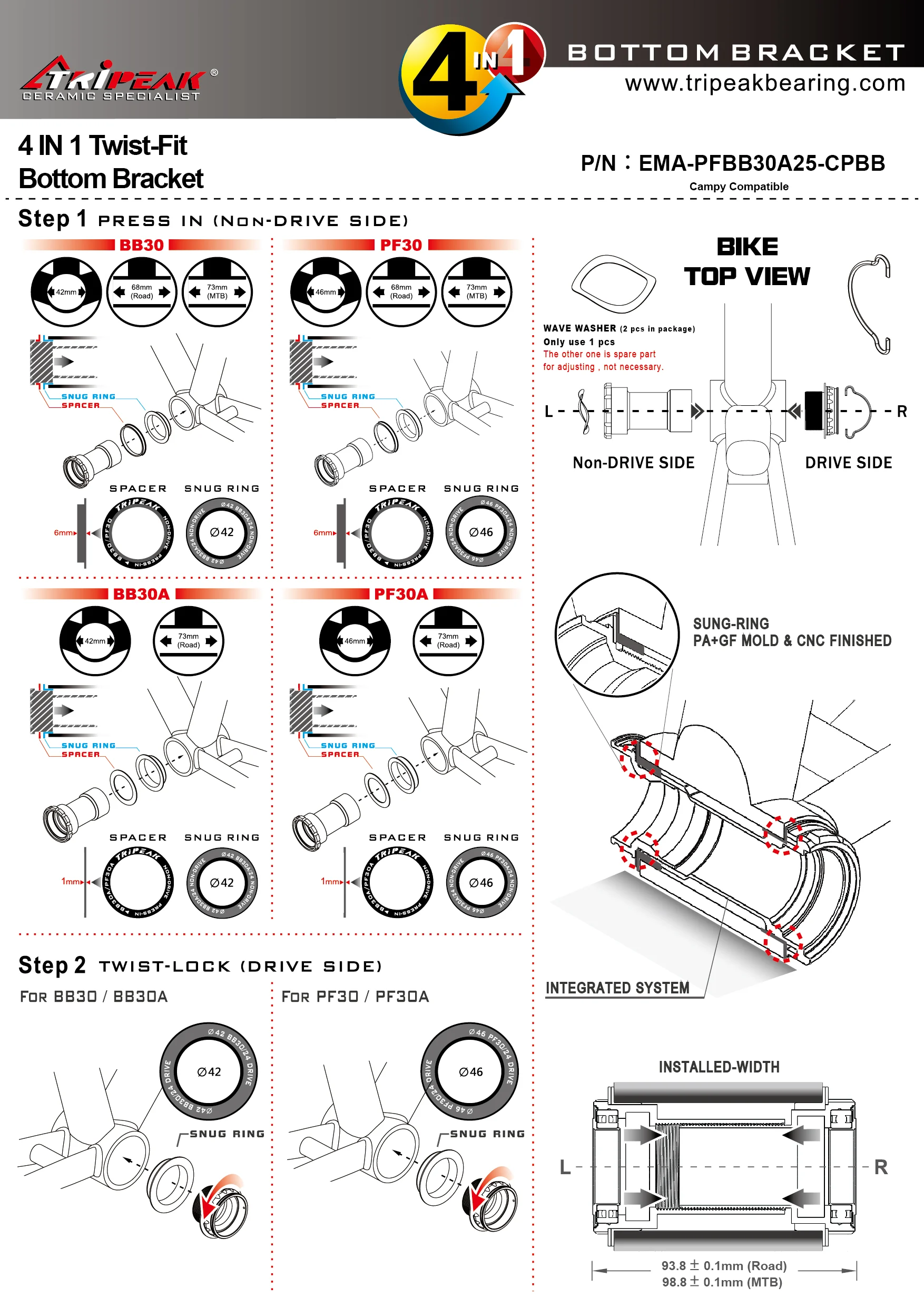 Tripeak Twistfit BB30 Krankbox 4 i en til Shimano gør installation af kranksæt på BB30 (42 mm/68 mm), BB30A (42 mm/73A), PF30 (46 mm/68 mm) og PF30A (46 mm/ 73 mm) mulig med en og samme krankbox ved hjælp af diverse spacere.