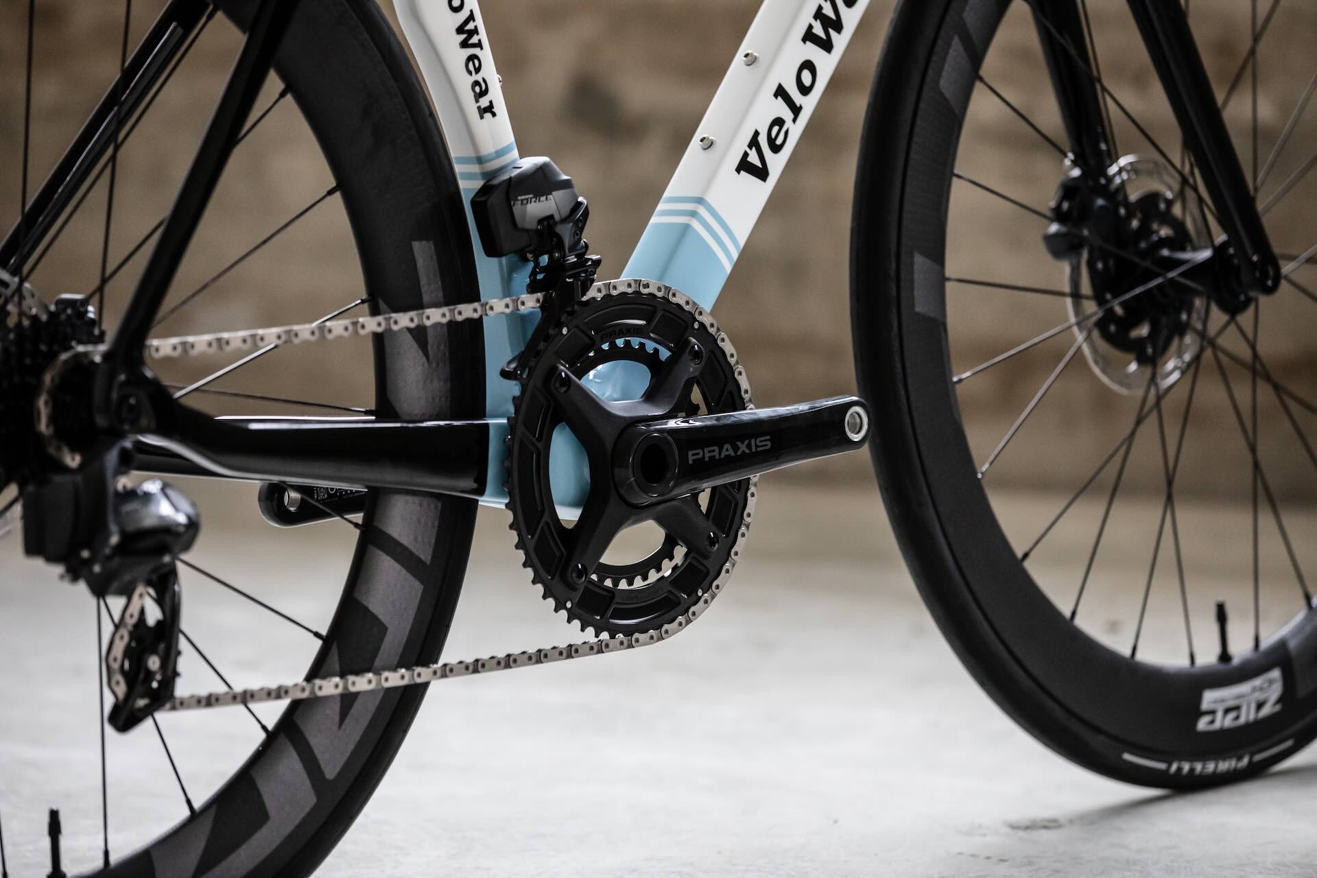 Det er Shimanos topgruppe Dura Ace 9270 Di2, som danner basis for denne konfiguration, kombineret med et top lækkert Hunt carbon hjulsæt, som i vindtunneltest har vist sig overlegent i forhold til langt dyrere hjul. Det er naturligvis Hunt Sub50 med carbon eger, der er tale om.